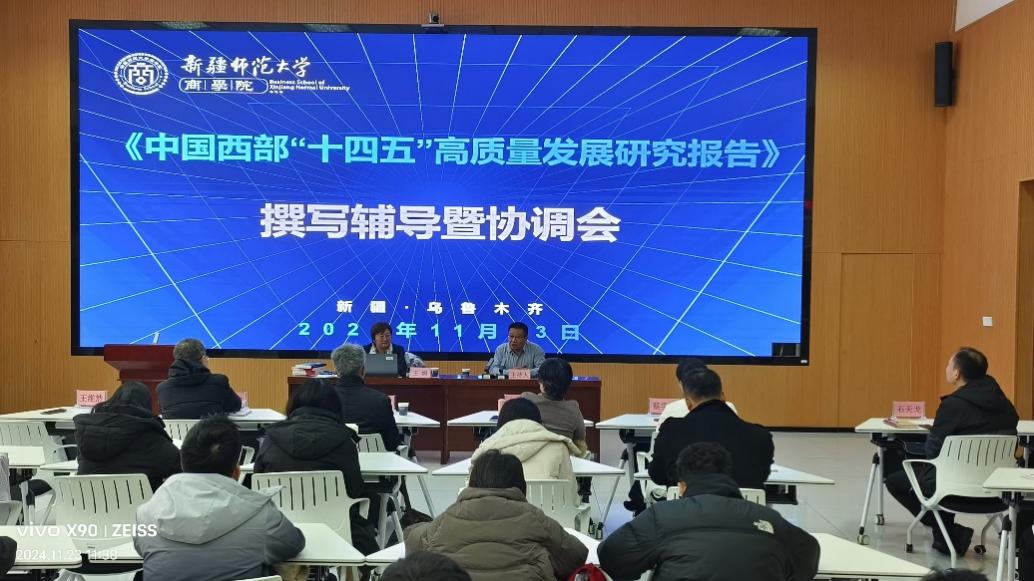 2024年11月23日,《中国西部“十四五”高质量发展研究报告》(以下简称“研究报告”)撰写辅导暨协调会在我校商学院成功召开。经济科学出版社财政分社社长王娟围绕研究报告的写作要求、财政分社的系列重要成果及出版书籍的相关政策给全院师生做了专题报告。中国(深圳)综合开发研究院西部办事处主任蔡学兰、新疆生产建设兵团国有资产监督管理委员会原副主任、一级巡视员宋宝林、兵团援疆办(经协办)原党组书记、主任尤小春、新疆生产建设兵团发展和改革委员会原副主任李健伟、新疆生产建设兵团统计局原副局长、一级巡视员兵团统计局张鹏受邀参加会议并给予相关指导。
